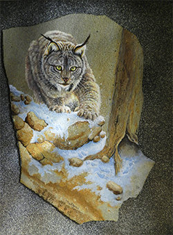 (title- Tracker) - Lynx on thin shale rock Mounted & Framed Original - 16"x20"
