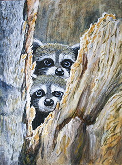 Raccoon babies in a old tree Title "Peeka Boo Bandits" 11"x14" print matted and framed under glass By Russ-tic Art - Russ Robbins |